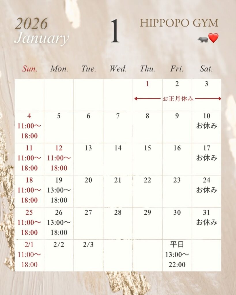 【1月のスケジュール🦛】 Uncategorized 2026.01.02 新年おめでとうございます🎍本年もどうぞよろしくお願い致します🤲皆さまにとっていい年になりますように! さて、今月のスケジュールです♪キッズクラスは8日17:00〜となります平日も時短営業等ございますので、お間違えのないようにお越しください🥊 どうぞ宜しくお願い致します😀